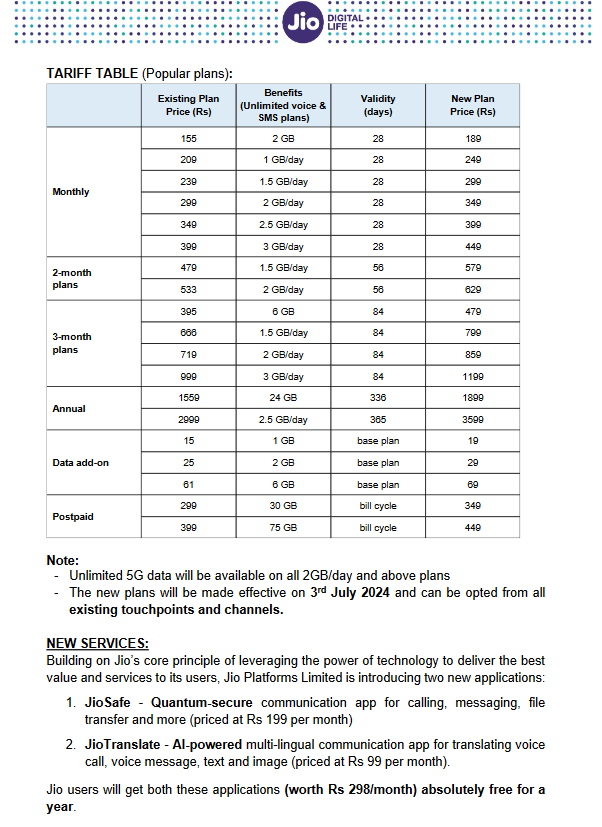 टैरिफ में यह बढ़ोतरी मासिक, दैनिक से लेकर वार्षिक तक सभी प्लान में की गई है।155 रुपये वाला प्लान, जो कि बेस ऑफरिंग था, अब 189 रुपये में मिलेगा और इसकी वैधता 28 दिन की ही रहेगी. 209 रुपये वाला प्लान अब 249 रुपये में मिलेगा और इसकी वैधता भी 28 दिन की ही रहेगी. इन प्लान के डेटा बेनिफिट्स पहले जैसे ही रहेंगे. 239 रुपये वाला प्लान जो कि अनलिमिटेड 5G डेटा देता था, अब नहीं देगा. 239 रुपये वाला प्लान अब 299 रुपये में मिलेगा और इसकी वैधता 28 दिन की होगी.अब अनलिमिटेड 5G डेटा केवल 2GB/दिन और उससे ज़्यादा वाले प्लान पर ही मिलेगा. नए प्लान 3 जुलाई 2024 से लागू होंगे।