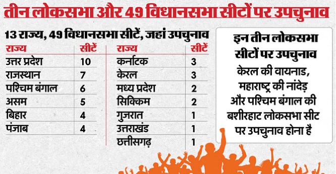 देशभर में 13 राज्यों की 49 विधानसभा सीटों और तीन लोकसभा सीटों पर जल्द ही उपचुनाव होने वाले हैं। चुनाव आयोग ने झारखंड और महाराष्ट्र विधानसभा चुनाव की तारीखों के साथ इन उपचुनावों की घोषणा भी कर दी है। इन उपचुनावों में सबसे चर्चित केरल की वायनाड लोकसभा सीट और उत्तर प्रदेश की करहल विधानसभा सीट हैं। आइए जानते हैं इन उपचुनावों की वजह और उन सीटों के बारे में जहां चुनाव होंगे।