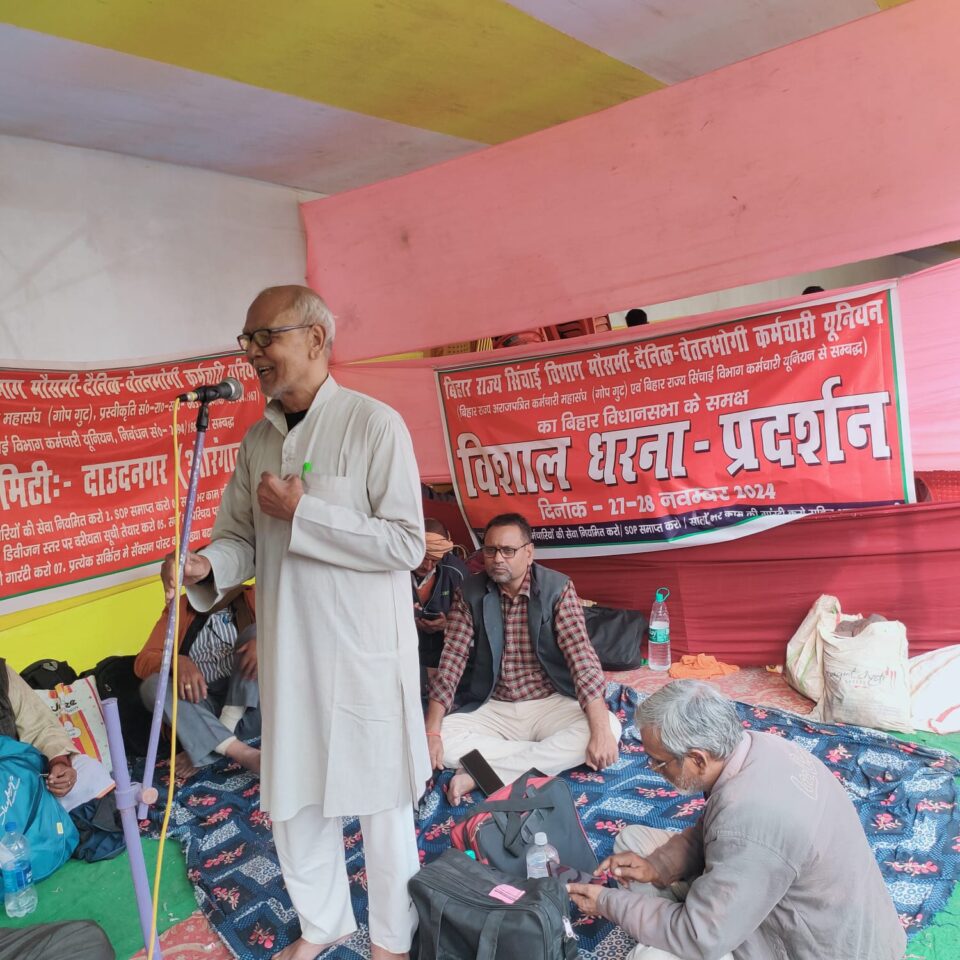 पटना:सिंचाई विभाग के मौसमी- दैनिक-वेतनभोगी कर्मचारियों ने आज सालों भर काम देने एवं अपनी सेवा के नियमितीकरण समेत अन्य पन्द्रह सूत्री मांगों की पूर्ति हेतु बिहार विधानसभा के समक्ष धरना दिया । सत्र के दौरान विधान सभा के समक्ष यह दो दिवसीय धरना सह प्रदर्शन कार्यक्रम किया,जो कल तक चलेगा । आज पूरे बिहार के विभिन्न जिलों से आए हजारों मौसमी कर्मियों ने अपराह्न 12 बजे से महासंघ(गोप गुट) के राज्याध्यक्ष निरंजन कुमार सिन्हा, महासचिव प्रेमचन्द कुमार सिन्हा,यूनियन के राज्याध्यक्ष जयराम सिंह, प्रधान सलाहकार सत्येन्द्र कुमार,राज्य उपाध्यक्ष रविशंकर कुमार, चितरंजन पांडेय,संगठन सचिव अर्जुन कुमार सिंह,देवगीर यादव,पुरुषोत्तम द्विवेदी,इत्यादि नेतृत्व में गेट पब्लिक लाइब्रेरी से एक विशाल जुलूस निकाला जो गर्दनीबाग आकर धरना में तब्दील हो गया । यहां धरना स्थल पर संघ के राज्याध्यक्ष जयराम सिंह की अध्यक्षता में एक विशाल सभा शुरू हुई जिसका संचालन संघ के प्रधान सलाहकार सत्येन्द्र कुमार ने किया ।इस सभा को बतौर मुख्य अतिथि भाकपा(माले) विधायक संदीप सौरभ ने संबोधित करते हुए कहा कि मौसमी कर्मी यदि अपने हक के लिए सड़क पर संघर्ष करते हैं तो हम भाकपा(माले) के भी सभी 11 विधायक सदन के अंदर आपके हकों की आवाज बुलंद करेंगे ! उन्होंने कहा कि मौसमी कर्मियों की सभी मांगें जायज हैं जिन्हें नीतीश कुमार की यह गरीब विरोधी सरकार उनकी मांगों को अनसुनी कर रही है ।