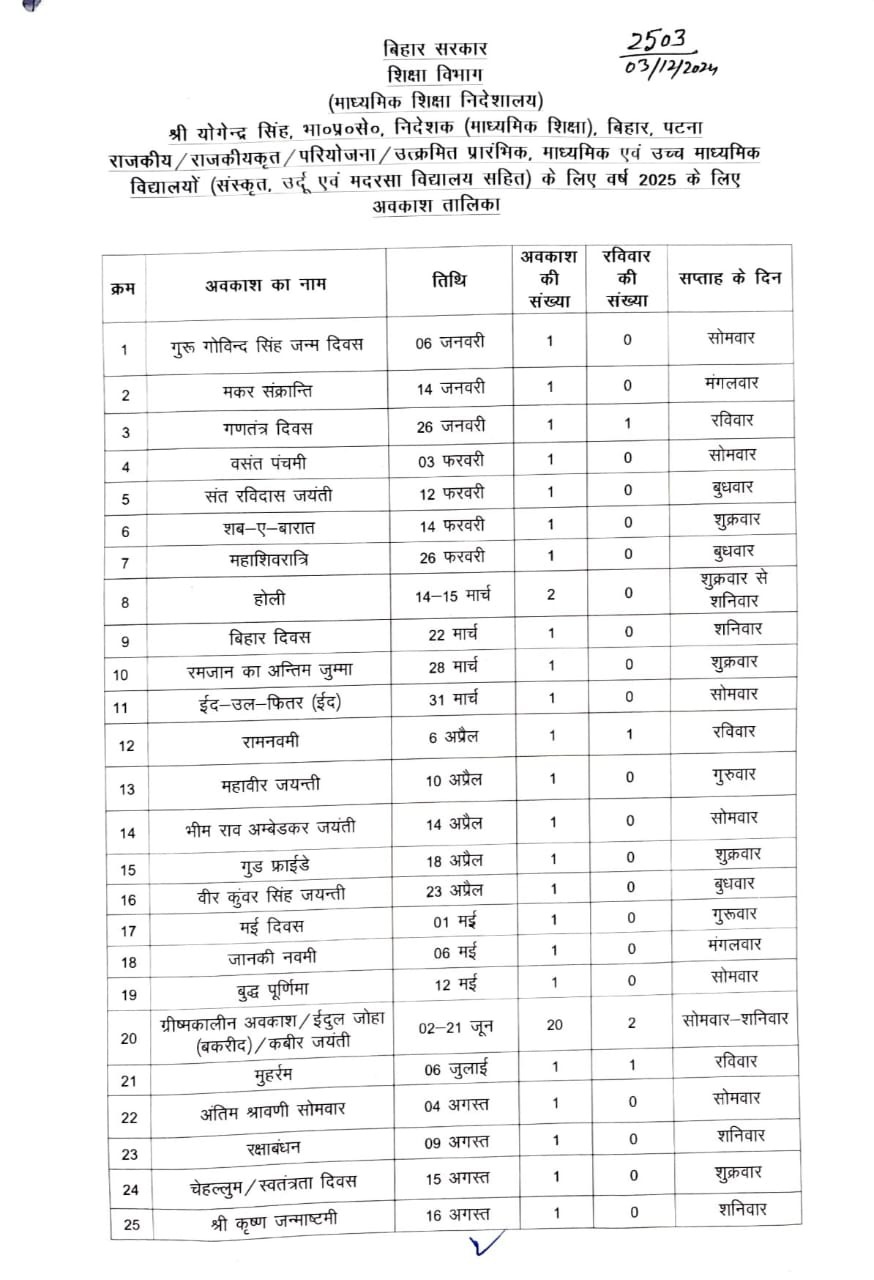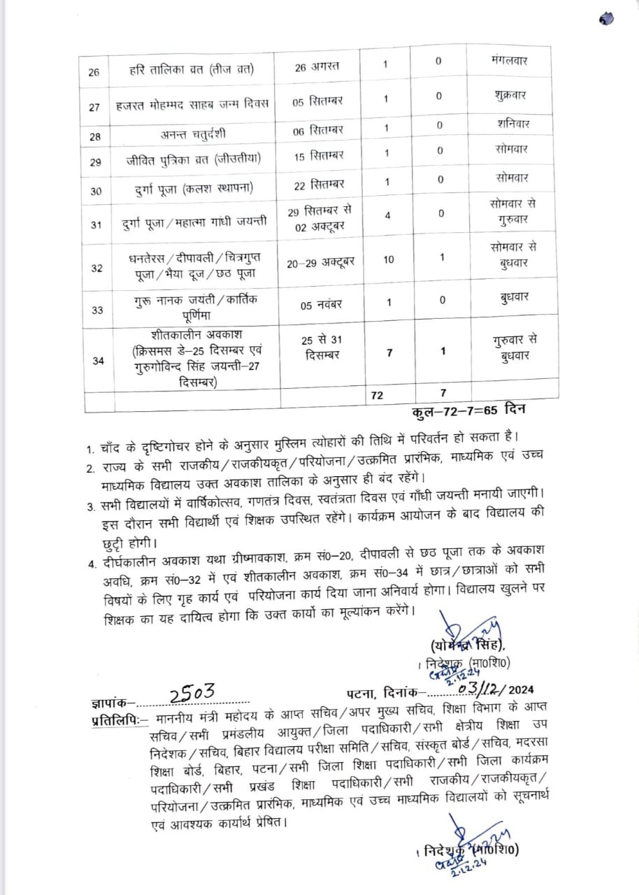 शिक्षा विभाग ने 6 जनवरी 2025 से 31 दिसंबर 2025 तक का छुट्टी कैलेंडर जारी किया है, जिसमें कुल 72 छुट्टियां निर्धारित की गई हैं। विशेष रूप से, जहां दशहरे पर शिक्षकों को पहले एक दिन की छुट्टी मिलती थी, अगले साल उन्हें दशहरे पर 5 दिन की छुट्टी मिलेगी। इसके अलावा, छठ महापर्व के दौरान दीपावली से लेकर छठ तक शिक्षकों को 10 दिनों की छुट्टी दी जाएगी।