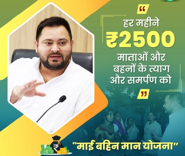 पटना:बीते दिनों तेजस्वी यादव ने घोषणा की थी कि 2025 में यदि बिहार में महागठबंधन की सरकार बनी, तो राज्य के लोगों को 200 यूनिट मुफ्त बिजली दी जाएगी। अब शनिवार को उन्होंने एक और बड़ा ऐलान किया। तेजस्वी यादव ने *”माई-बहिन मान योजना”* की शुरुआत करने की घोषणा की, जिसके तहत बिहार में हर महिला के खाते में 2500 रुपये प्रति माह भेजने की बात कही गई।