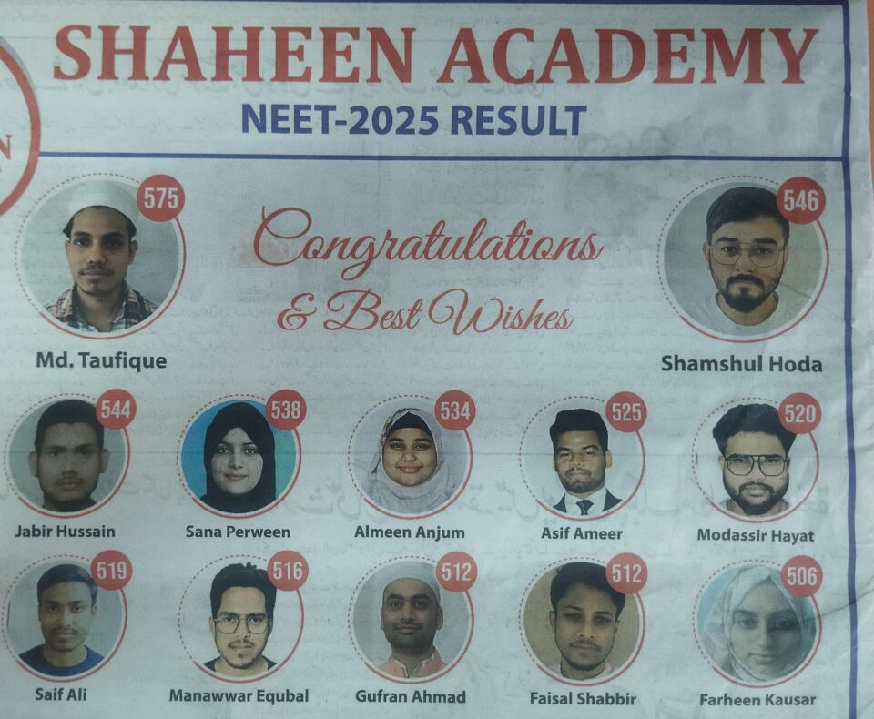 शाहीन एकेडमी के छात्रों ने नीट 2025 में असाधारण अंक हासिल किए हैं। मोहम्मद तौफीक ने 575 अंकों के साथ एकेडमी में शीर्ष स्थान प्राप्त किया, जो उनकी कड़ी मेहनत और लगन का प्रतीक है। अन्य छात्रों में समसूल हुदा ने 546, जाबिर हुसैन ने 544, सना परवीन ने 538, अलमीन अंजुम ने 534, आसिफ अमीर ने 525, मुदस्सिर हयात ने 520, सैफ अली ने 519, मुनव्वर इकबाल ने 516, गुफरान अहमद और फैसल शब्बीर ने 512, तथा फरहीन कौसर ने 507 अंक हासिल किए। इन सभी छात्रों ने अपनी मेहनत और एकेडमी के मार्गदर्शन से यह मुकाम हासिल किया है।