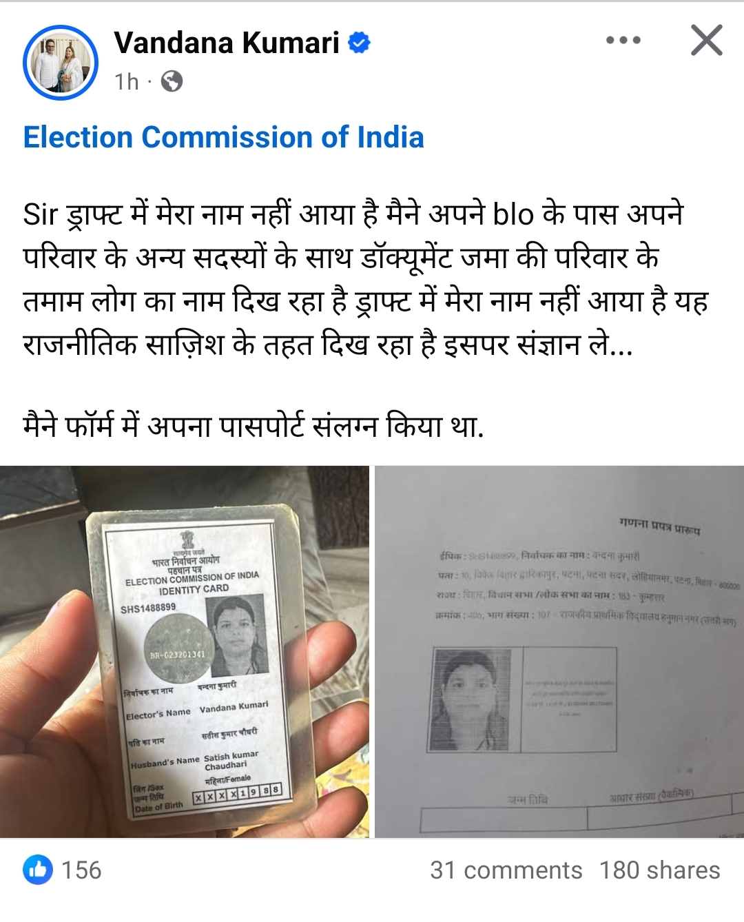 वंदना कुमारी ने अपने फेसबुक पेज पर इस मुद्दे को उठाते हुए लिखा, “एसआईआर ड्राफ्ट में मेरा नाम नहीं आया है। मैंने अपने बीएलओ के पास अपने परिवार के अन्य सदस्यों के साथ डॉक्यूमेंट जमा किए थे। परिवार के तमाम लोगों का नाम दिख रहा है, लेकिन ड्राफ्ट में मेरा नाम नहीं आया है। यह राजनीतिक साजिश के तहत दिख रहा है, इस पर संज्ञान लें। मैंने फॉर्म में अपना पासपोर्ट संलग्न किया था।” उन्होंने अपने पोस्ट में भारत निर्वाचन आयोग को टैग भी किया।