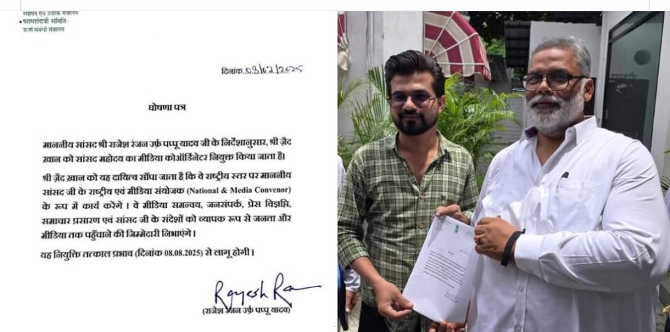 ज़ैद खान को दी गई इस नई जिम्मेदारी में उनकी भूमिका मीडिया समन्वय, प्रेस विज्ञप्तियों की तैयारी, समाचार प्रसारण, और जनसंपर्क को प्रभावी ढंग से संचालित करने की होगी। उनकी सक्रियता और अनुभव के आधार पर उम्मीद की जा रही है कि सांसद पप्पू यादव के विचार, उनकी नीतियां, और जनता से जुड़े मुद्दे देश के कोने-कोने तक और अधिक प्रभावी तरीके से पहुंचेंगे।