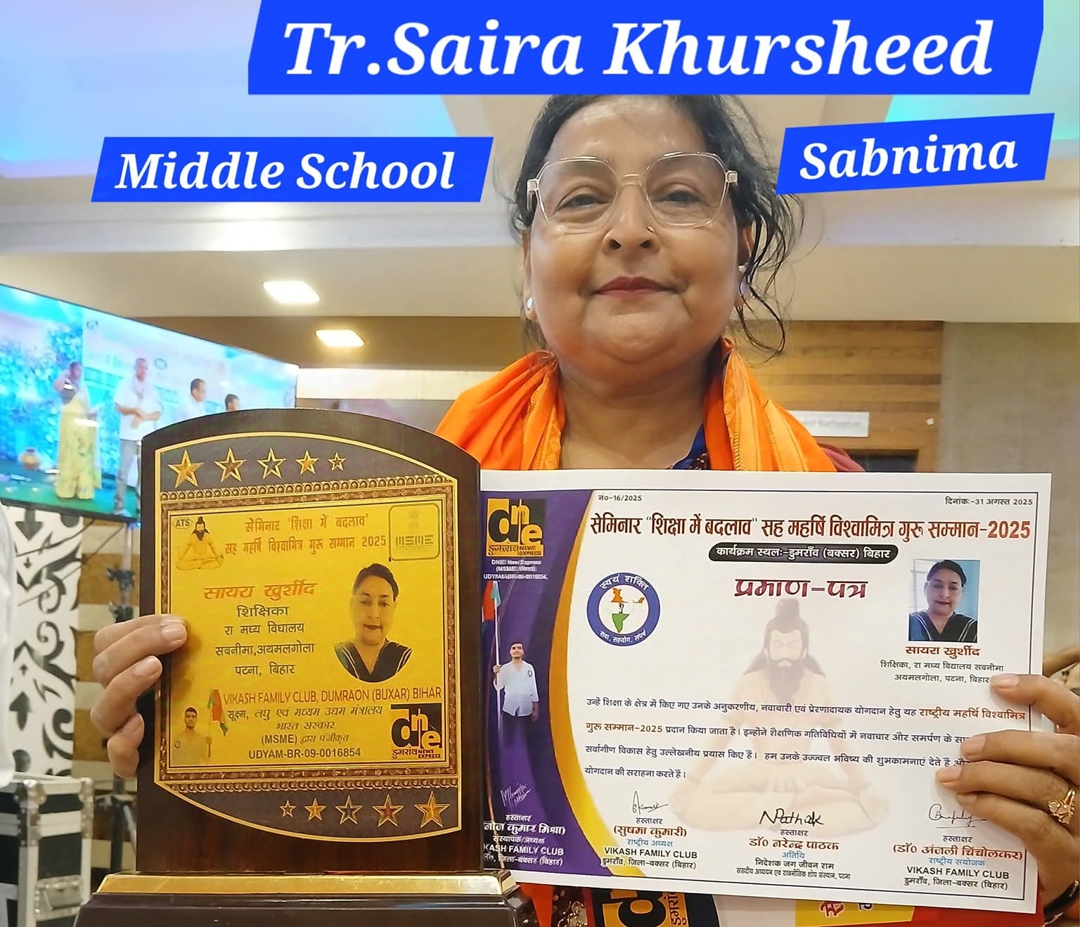 पटना जिला अंतर्गत सबनीमा मध्य विद्यालय की शिक्षिका सायरा खुर्शीद एक ऐसी शिक्षिका हैं, जिन्होंने अपनी पढ़ाई पूरी करने के बाद शिक्षण के क्षेत्र में कदम रखा और बच्चों के जीवन को संवारने का बीड़ा उठाया। 2007 में अपनी शिक्षण यात्रा शुरू करने वाली सायरा ने शुरुआत में नौवीं और दसवीं कक्षा के बच्चों को पढ़ाया, और अब वे कक्षा एक से आठ तक के बच्चों को ज्ञान और प्रेरणा दे रही हैं। उनकी यह यात्रा केवल पाठ्यपुस्तकों तक सीमित नहीं रही, बल्कि उन्होंने बच्चों के सर्वांगीण विकास को अपनी प्राथमिकता बनाया।