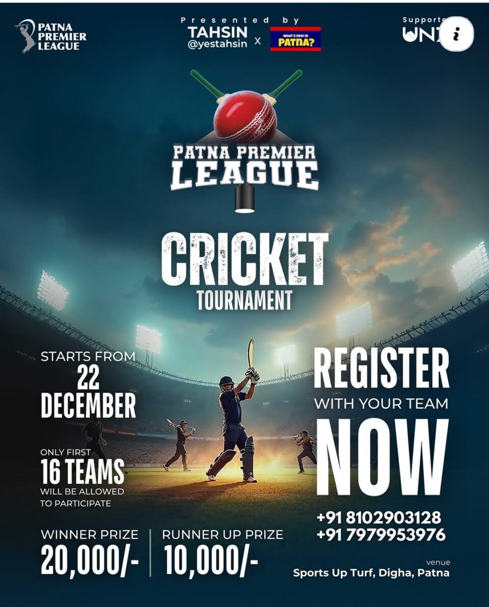 पटना। बिहार की राजधानी पटना में क्रिकेट प्रेमियों के लिए बड़ी खुशखबरी! पटना प्रीमियर लीग (PPL) नाम से एक शानदार टी-10 क्रिकेट टूर्नामेंट शुरू होने जा रहा है। यह टूर्नामेंट 22 दिसंबर 2025 से शुरू होगा और शहर के युवा क्रिकेटरों को अपनी प्रतिभा दिखाने का शानदार मौका मिलेगा।टूर्नामेंट की खास बात ये है कि केवल पहले 16 टीमों को ही रजिस्ट्रेशन मिलेगा।पहले आओ, पहले पाओ के आधार पर इंट्री मिलेगी। विजेता टीम को नकद पुरस्कार 20,000 रुपये एवं उप-विजेता टीम को 10,000 रुपये मिलेंगे। टूर्नामेंट का आयोजन स्पोर्ट्स उप टर्फ दीघा, पटना में होगा।