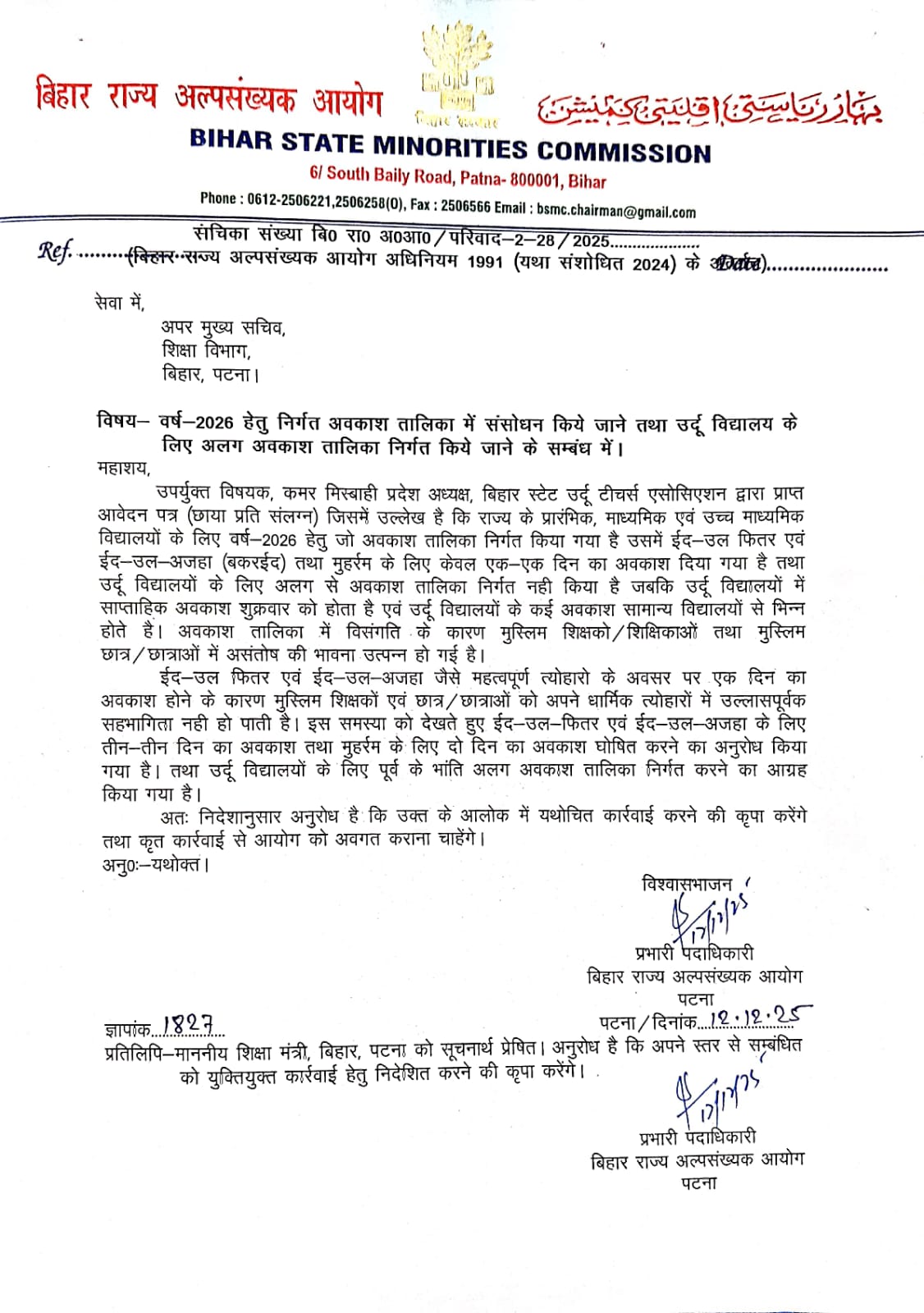 शिकायत में कहा गया है कि ईद जैसे महत्वपूर्ण त्योहारों पर एक दिन की छुट्टी से मुस्लिम शिक्षक और छात्र छात्राएं धार्मिक उत्सवों में पूरी तरह भाग नहीं ले पाते। इसलिए ईद-उल-फितर और ईद-उल-अजहा के लिए तीन-तीन दिन तथा मुहर्रम के लिए दो दिन की छुट्टी देने की मांग की गई है। साथ ही, पूर्व की तरह उर्दू विद्यालयों के लिए अलग अवकाश तालिका जारी करने का अनुरोध किया गया है।आयोग के प्रभारी पदाधिकारी ने पत्र में शिक्षा विभाग से यथाशीघ्र कार्रवाई करने और आयोग को अवगत कराने को कहा है। पत्र की प्रतिलिपि शिक्षा मंत्री को भी भेजी गई है, ताकि वे अपने स्तर से निर्देश जारी करें।