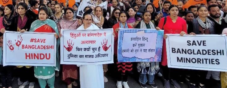 बांग्लादेश में हिंदू अल्पसंख्यकों पर हो रही कथित हिंसा के विरोध में विश्व हिंदू परिषद (VHP) और हिंदू युवा वाहिनी ने मंगलवार को दिल्ली स्थित बांग्लादेश उच्चायोग के बाहर जोरदार प्रदर्शन किया। प्रदर्शनकारियों का आरोप है कि बांग्लादेश में हिंदू समुदाय को निशाना बनाया जा रहा है, उनके घरों को नुकसान पहुंचाया जा रहा है और महिलाओं के साथ अभद्र व्यवहार की घटनाएं सामने आ रही हैं।