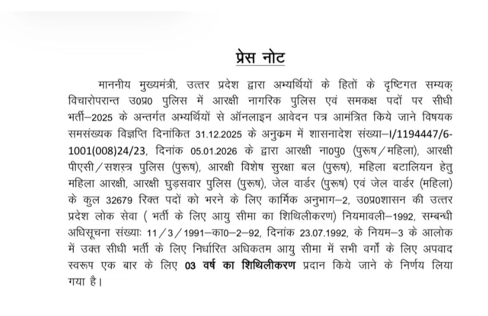 UP Police Recruitment 2025: उत्तर प्रदेश में पुलिस भर्ती की तैयारी कर रहे युवाओं के लिए योगी आदित्यनाथ सरकार ने बड़ी राहत का ऐलान किया है। मुख्यमंत्री के निर्देश पर पुलिस और जेल विभाग की सीधी भर्ती-2025 में आयु सीमा को लेकर महत्वपूर्ण निर्णय लिया गया है। आरक्षी नागरिक पुलिस और समकक्ष पदों पर होने वाली भर्ती के लिए सभी वर्गों के अभ्यर्थियों को अधिकतम आयु सीमा में एकमुश्त तीन वर्ष की छूट दी जाएगी। इस संबंध में शासनादेश जारी कर दिया गया है।