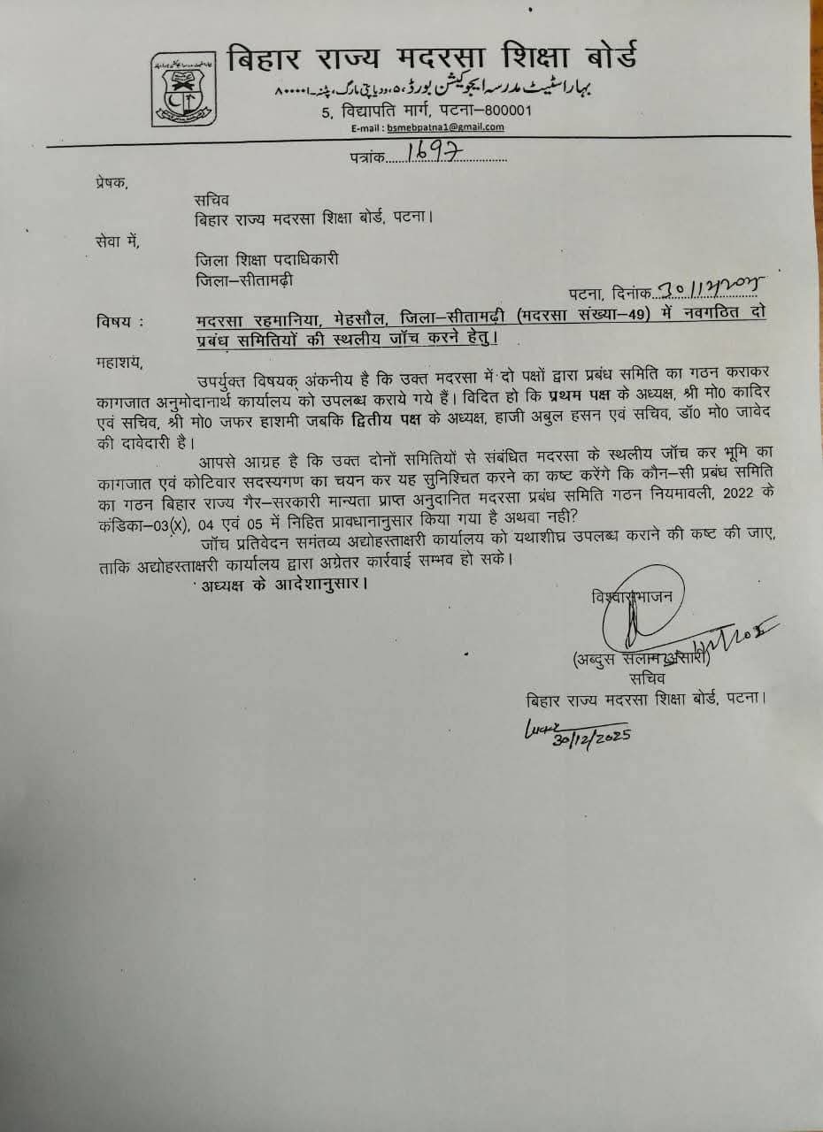 सीतामढ़ी/पटना:बिहार राज्य मदरसा शिक्षा बोर्ड ने सीतामढ़ी जिले के मदरसा रहमानिया, मेहसौल (मदरसा संख्या-49) में दो अलग-अलग पक्षों द्वारा गठित प्रबंध समितियों के विवाद पर गंभीरता दिखाई है। बोर्ड के सचिव अब्दुस सलाम अंसारी ने 30 दिसंबर 2025 को पत्रांक 1697 जारी कर जिला शिक्षा पदाधिकारी, सीतामढ़ी को निर्देश दिया है कि दोनों समितियों की स्थलीय जांच कराई जाए और यह सुनिश्चित किया जाए कि कौन-सी समिति बिहार राज्य गैर-सरकारी मान्यता प्राप्त अनुदानित मदरसा प्रबंध समिति गठन नियमावली, 2022 के प्रावधानों के अनुरूप गठित है।