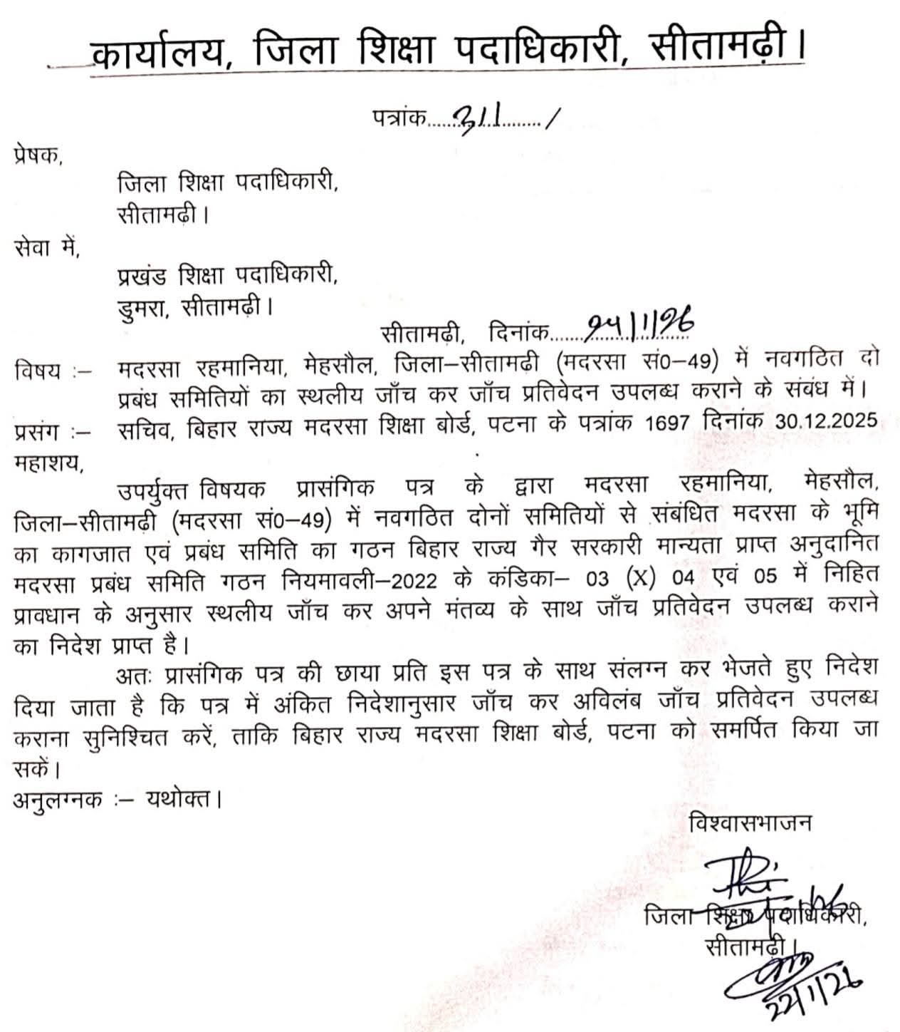 इसके बाद जिला शिक्षा पदाधिकारी, सीतामढ़ी ने 22 जनवरी 2026 को पत्रांक 31/ जारी कर प्रखंड शिक्षा पदाधिकारी, डुमरा को निर्देश दिया कि बोर्ड के पत्र की छाया प्रति संलग्न कर स्थलीय जांच अविलंब पूरी करें और रिपोर्ट उपलब्ध कराएं। जांच में मदरसा की भूमि दस्तावेज, समिति गठन प्रक्रिया और नियमावली का पालन जांचा जाएगा।
