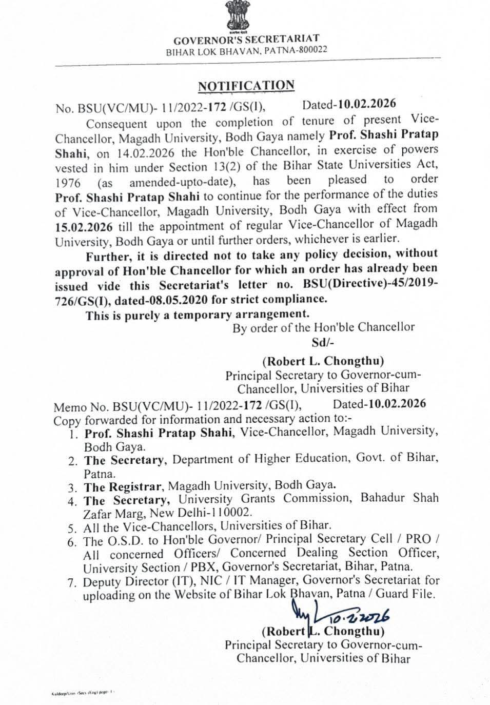 पटना: बिहार के राज्यपाल एवं कुलाधिपति आरिफ मोहम्मद खान ने मगध विश्वविद्यालय, बोधगया के वर्तमान कुलपति प्रोफेसर शशि प्रताप शाही का कार्यकाल समाप्त होने के बाद उन्हें अस्थायी रूप से पद पर जारी रखने का आदेश जारी किया है।राज्यपाल सचिवालय द्वारा जारी अधिसूचना के अनुसार प्रो. शशि प्रताप शाही का नियमित कार्यकाल 14 फरवरी 2026 को समाप्त हो रहा है। इसके बाद बिहार राज्य विश्वविद्यालय अधिनियम के तहत राज्यपाल ने उन्हें 15 फरवरी 2026 से नियमित कुलपति की नियुक्ति होने या आगे के आदेश तक (जो पहले हो) कुलपति के कर्तव्यों का निर्वहन जारी रखने का निर्देश दिया है।यह व्यवस्था पूरी तरह अस्थायी बताई गई है। अधिसूचना में स्पष्ट निर्देश दिया गया है कि इस दौरान कोई भी नीतिगत निर्णय बिना राज्यपाल की पूर्व अनुमति के नहीं लिया जाएगा।